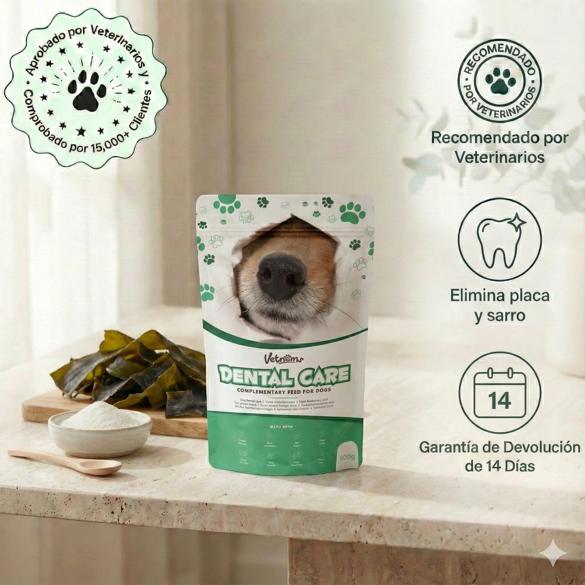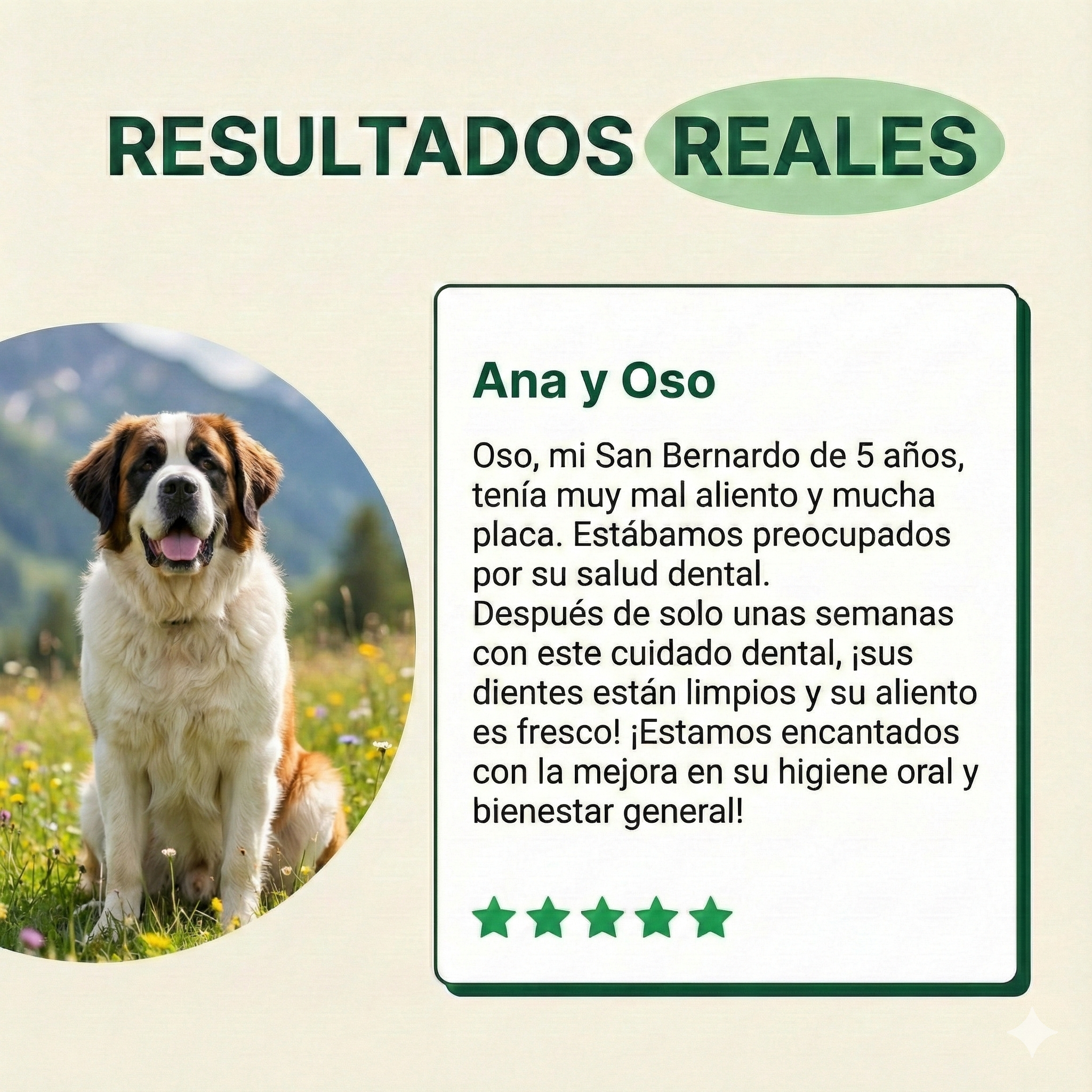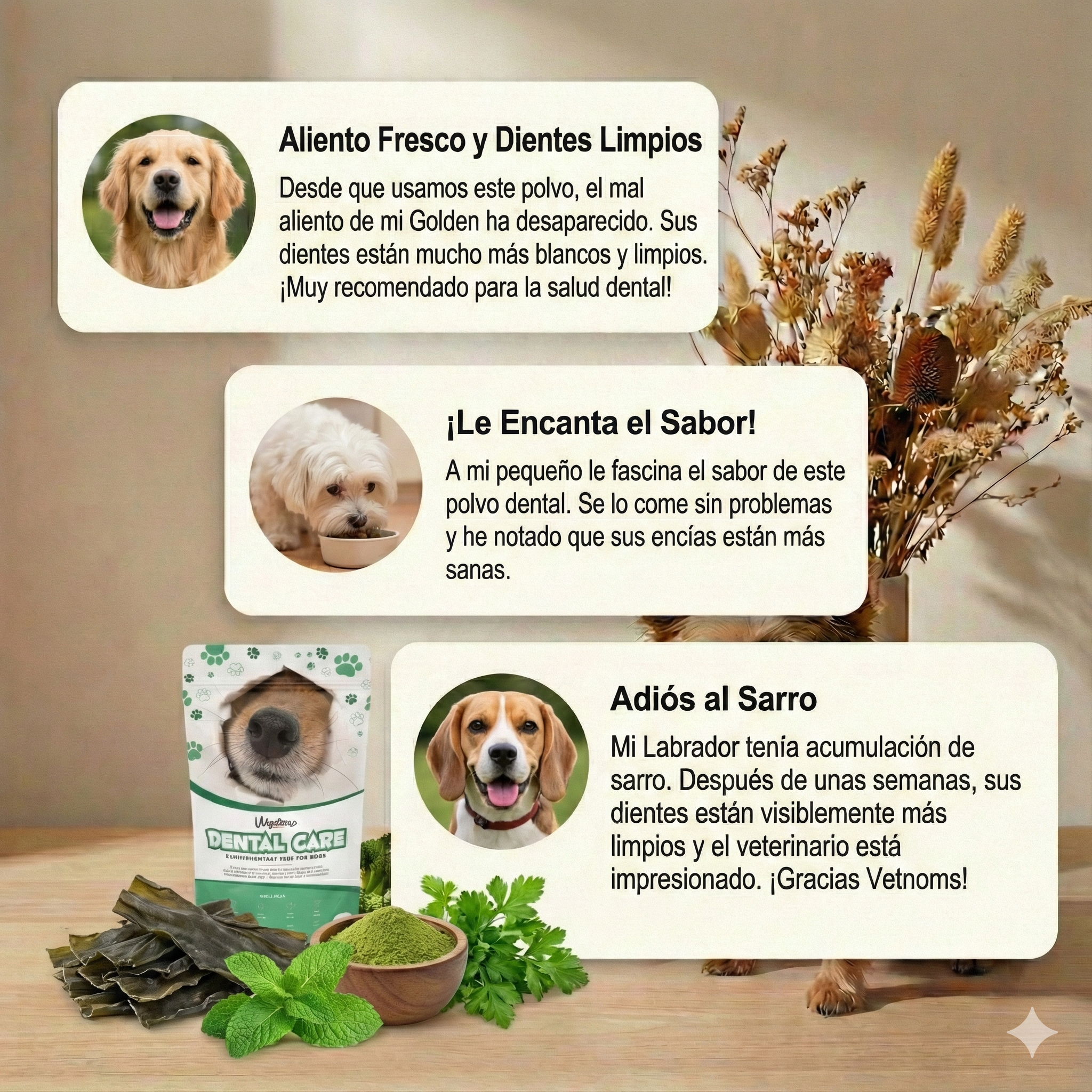 "Mi border collie de 7 años tenía un aliento horrible y sarro acumulado que me avergonzaba cuando venían visitas. Después de usar Vetnoms Dental Care durante 2 meses, sus dientes están notablemente más blancos, sus encías dejaron de sangrar, y su aliento mejoró MUCHÍSIMO. Lo mejor? Sin estrés, sin cepillos, solo espolvoreo en su comida!"